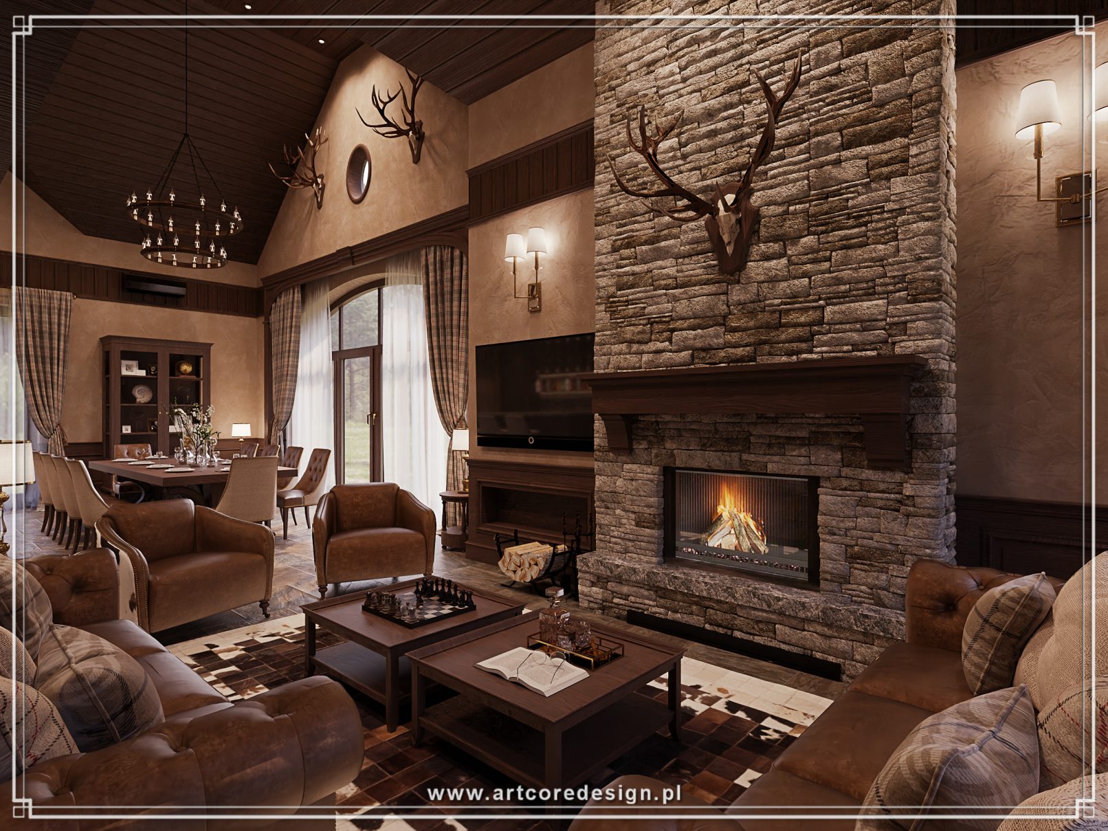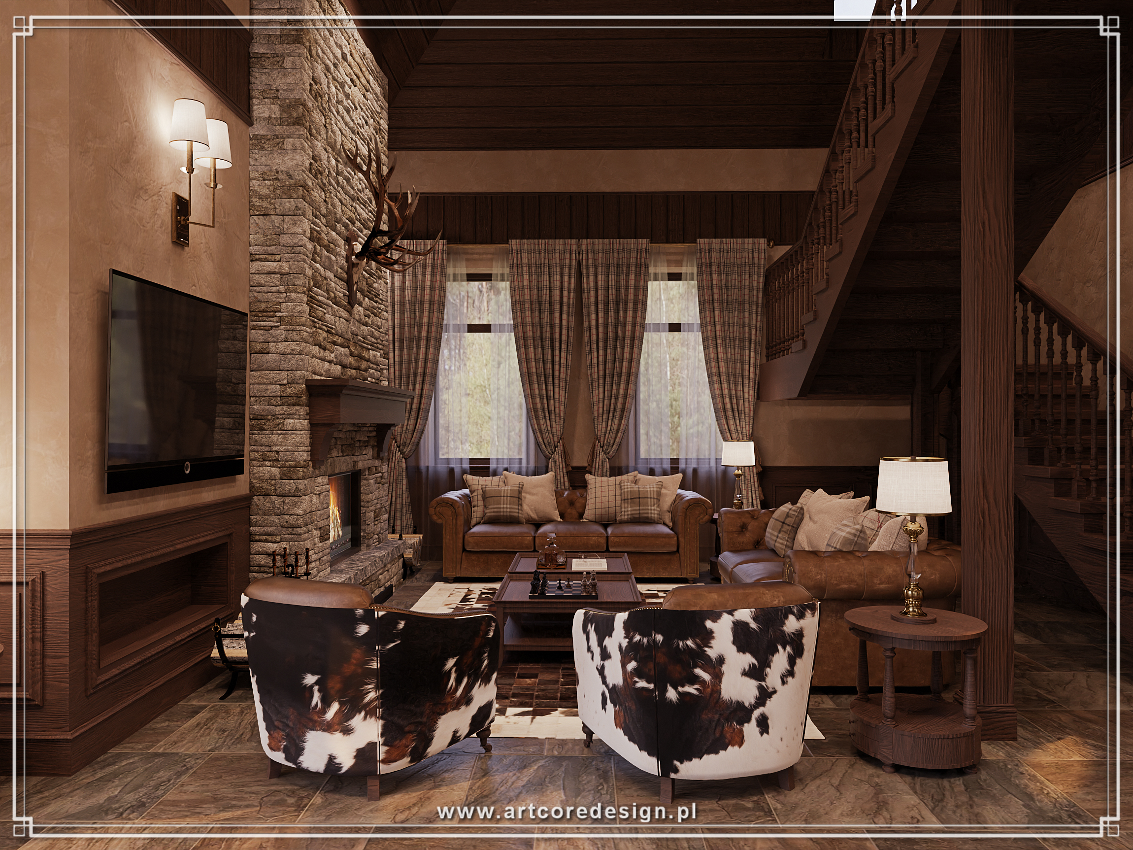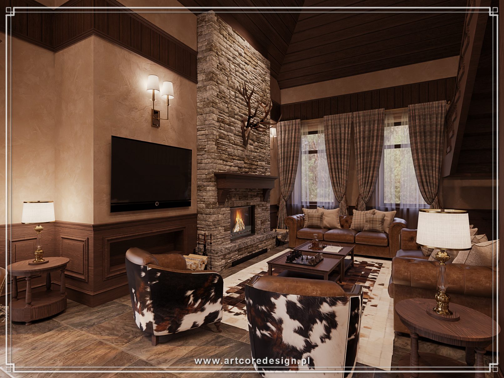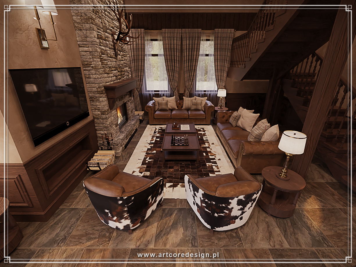 W centralnym punkcie domu znajduje się imponujący kamienny kominek, który jest nie tylko wizualnym centrum salonu, ale także jego sercem, wnoszącym przytulność w chłodne wieczory. Mięsiste skórzane sofy i akcenty z naturalnego drewna tworzą atmosferę sprzyjającą relaksowi. Każdy element, od tradycyjnych zasłon po detale w postaci rogów nad kominkiem, nawiązuje do myśliwskiego charakteru miejsca.