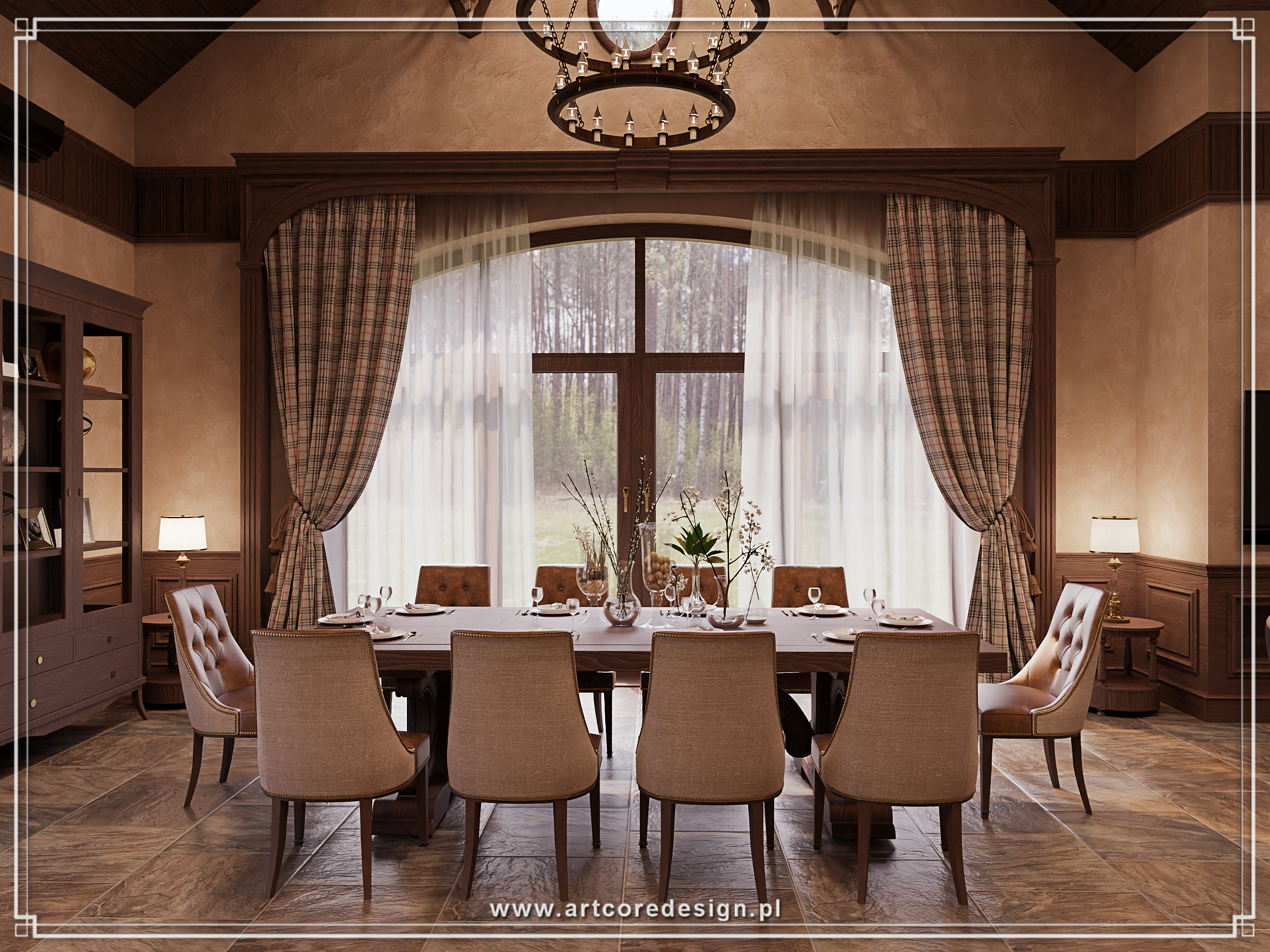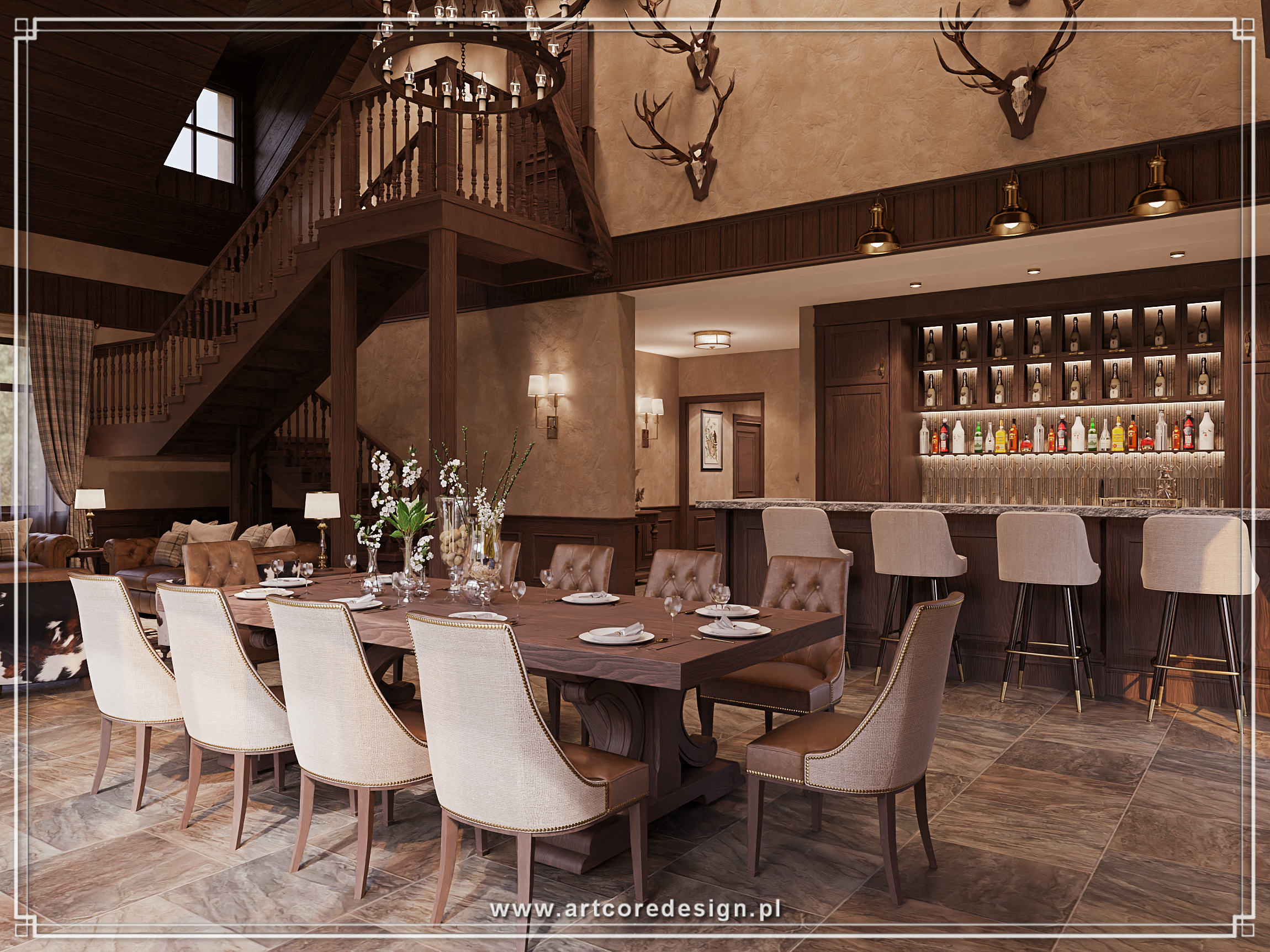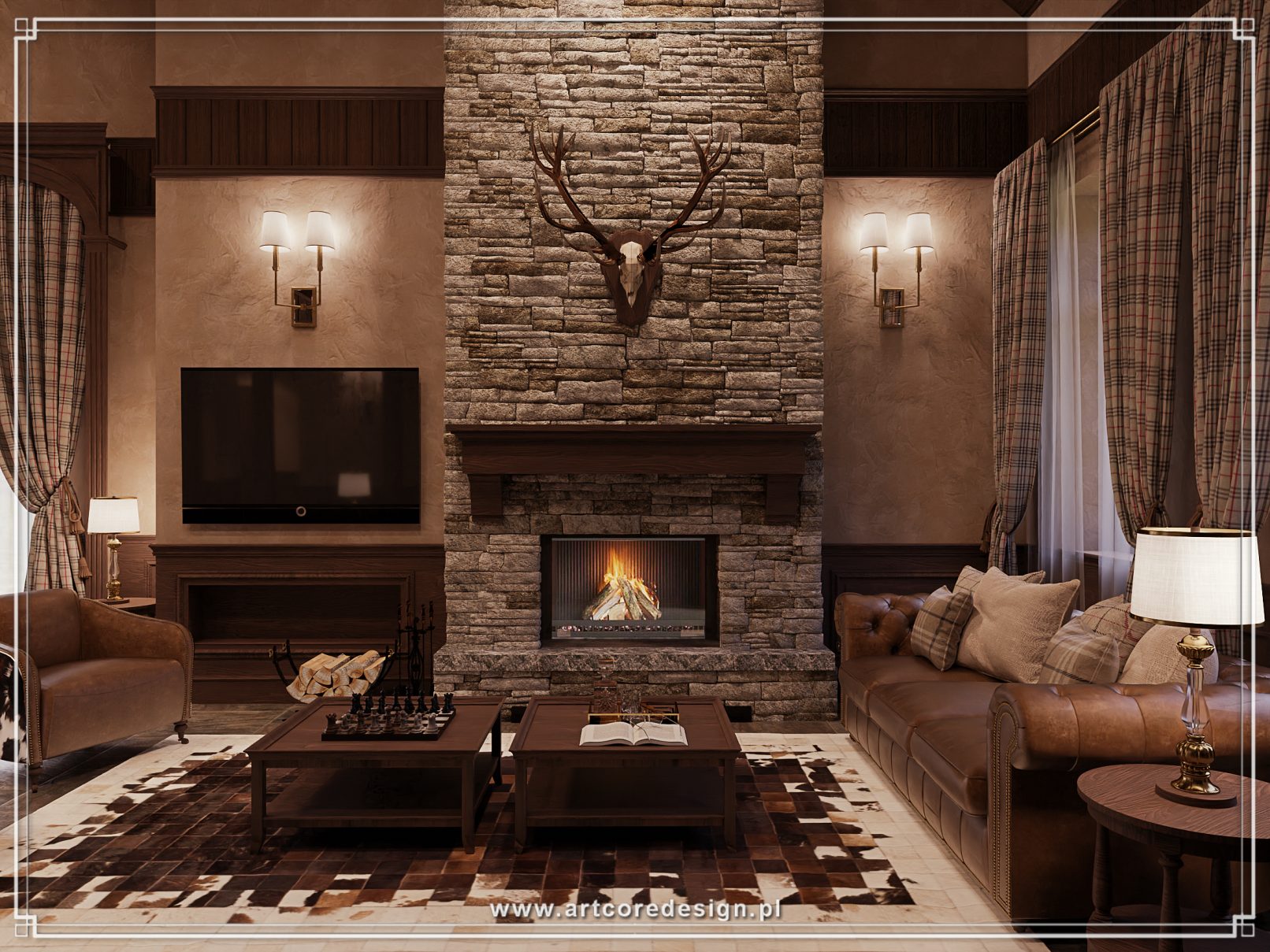 W centralnym punkcie domu znajduje się imponujący kamienny kominek, który jest nie tylko wizualnym centrum salonu, ale także jego sercem, wnoszącym przytulność w chłodne wieczory. Mięsiste skórzane sofy i akcenty z naturalnego drewna tworzą atmosferę sprzyjającą relaksowi. Każdy element, od tradycyjnych zasłon po detale w postaci rogów nad kominkiem, nawiązuje do myśliwskiego charakteru miejsca.