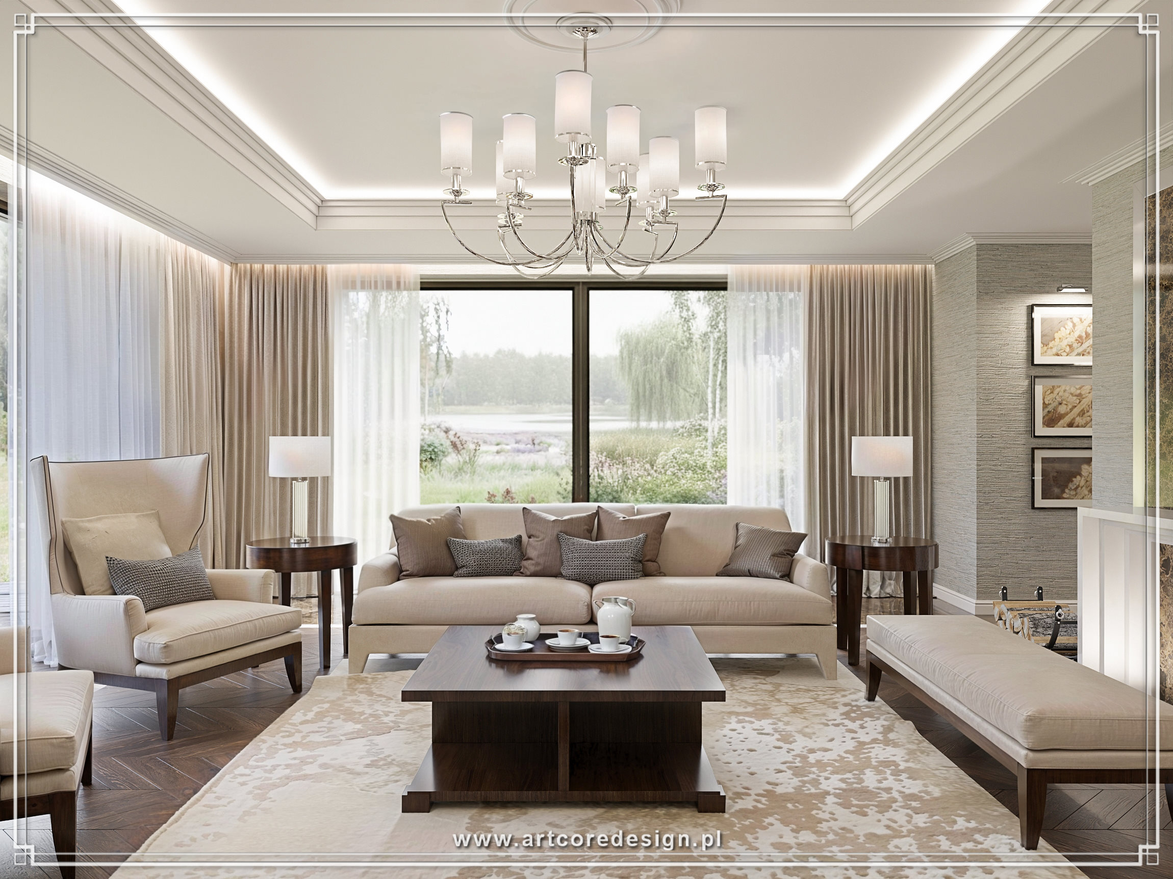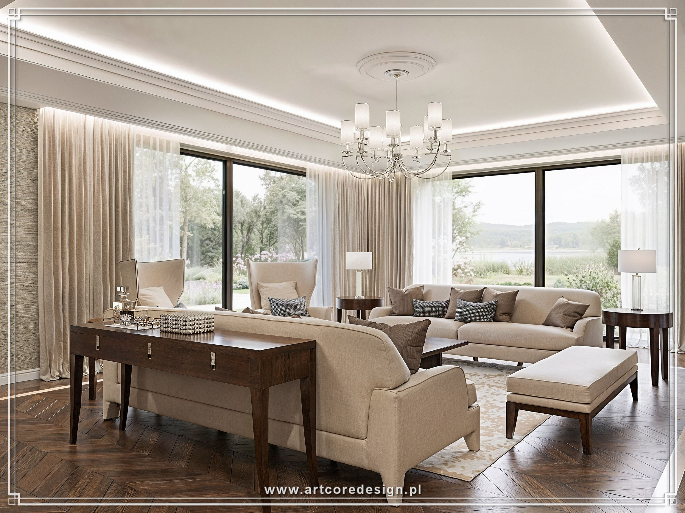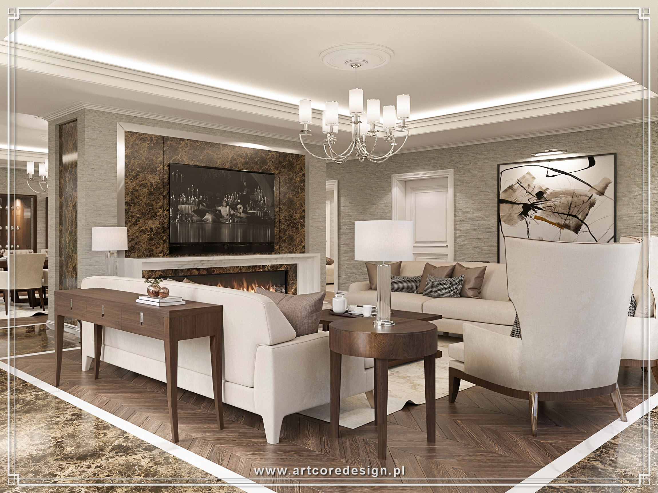 Prezentowana rezydencja to przykład idealnej harmonii między elegancją a funkcjonalnością. Już od pierwszego spojrzenia przyciąga uwagę przestronna strefa dzienna, w której króluje klasyczny kominek otoczony marmurowymi płytami. Delikatne odcienie beżu i bieli przełamane akcentami naturalnego drewna tworzą ciepłą i przytulną atmosferę. W centralnej części salonu ustawiono wygodne, tapicerowane meble, które zachęcają do relaksu przy blasku ognia.