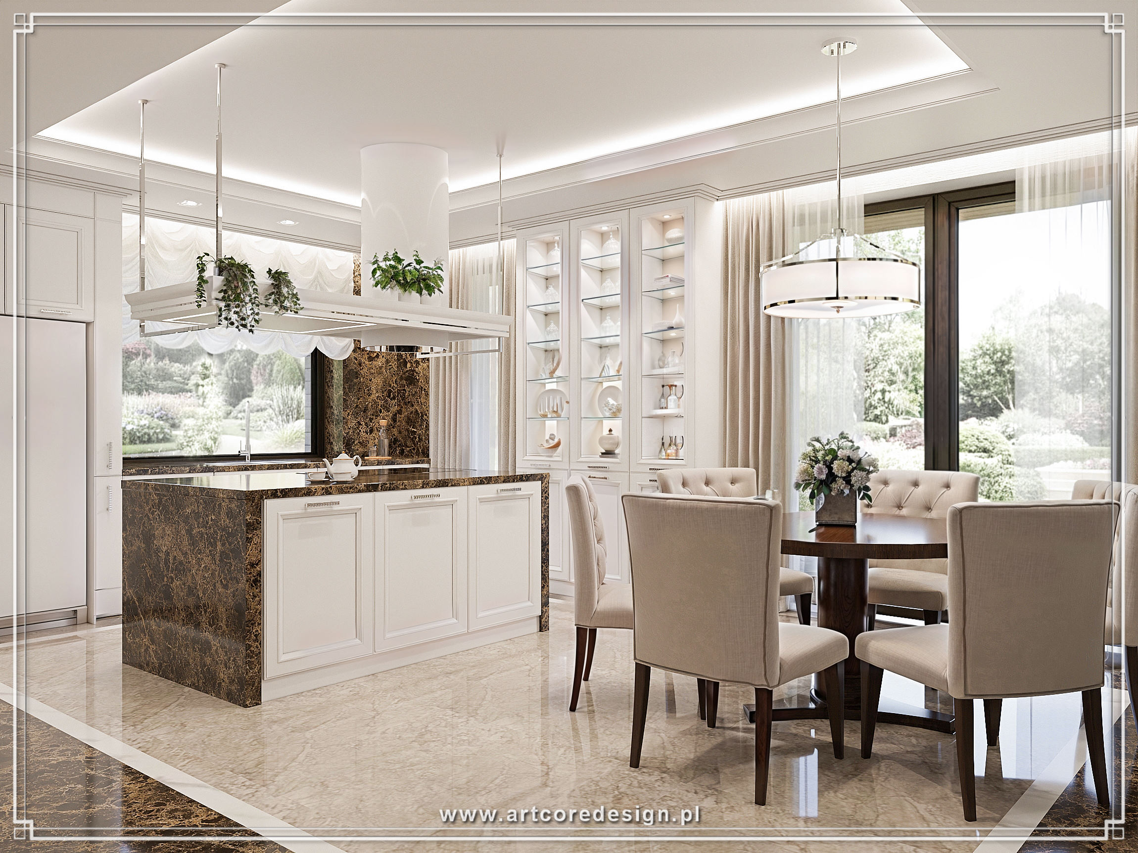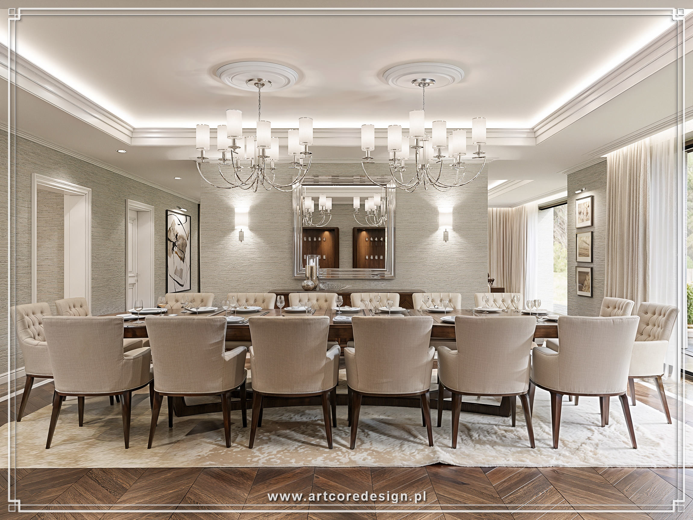 Jadalnia, połączona subtelnie z salonem, to kwintesencja stylu i wyrafinowania. Długi stół z ciemnego drewna otoczony jest luksusowymi, welurowymi krzesłami, które wprowadzają nutę elegancji. Całość dopełniają delikatne, stylowe żyrandole, które rozpraszają światło, tworząc przyjemny klimat podczas rodzinnych spotkań.