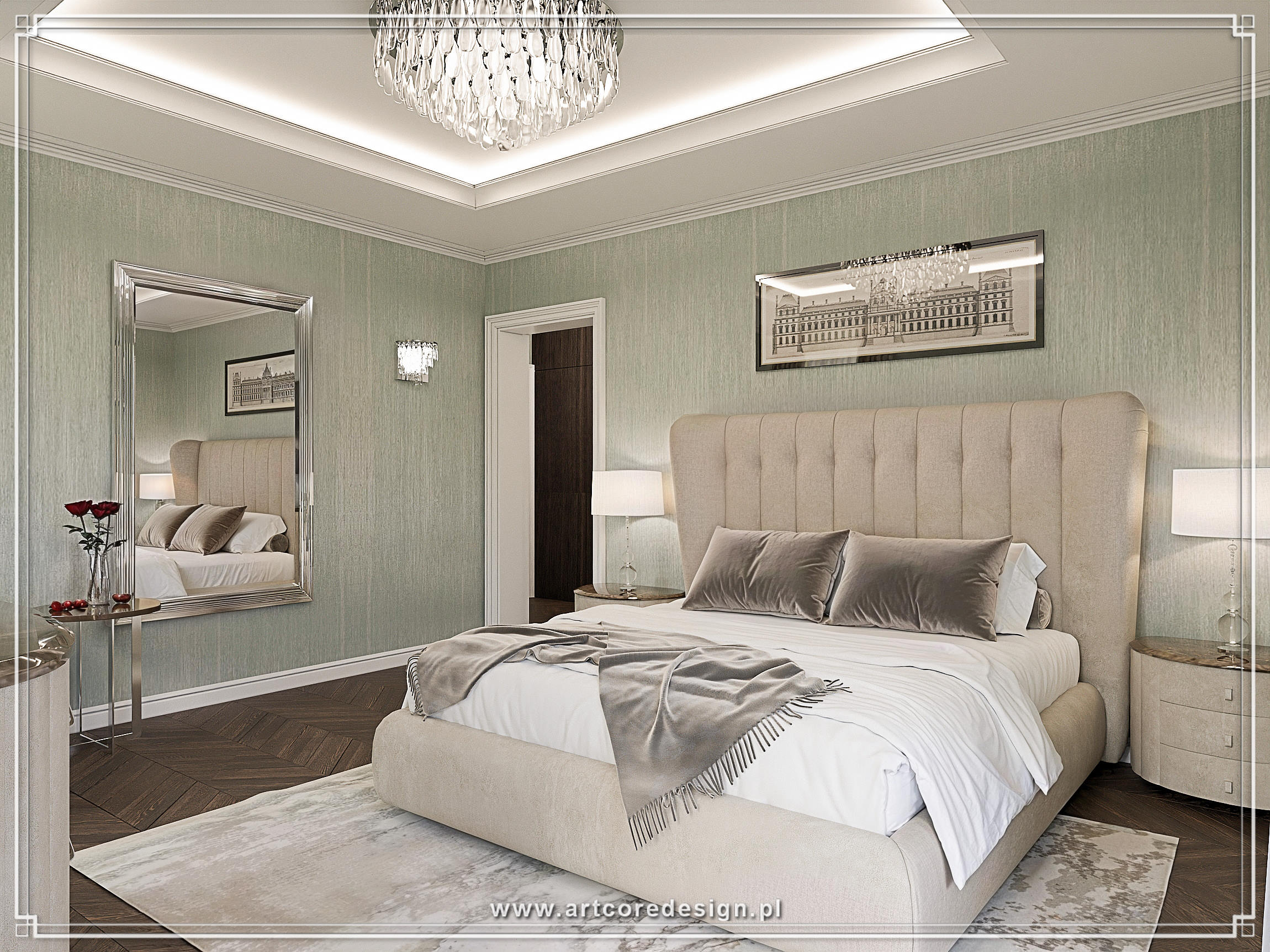 Kuchnia to połączenie nowoczesności z klasycznymi detalami. Marmurowe blaty, fronty szafek w delikatnym odcieniu kości słoniowej oraz eleganckie uchwyty sprawiają, że wnętrze jest nie tylko estetyczne, ale i praktyczne. Strefa wypoczynkowa w sypialni wyróżnia się subtelnością i spokojem – miękkie tkaniny, tapicerowane łóżko oraz pastelowe dodatki wprowadzają harmonię i równowagę.