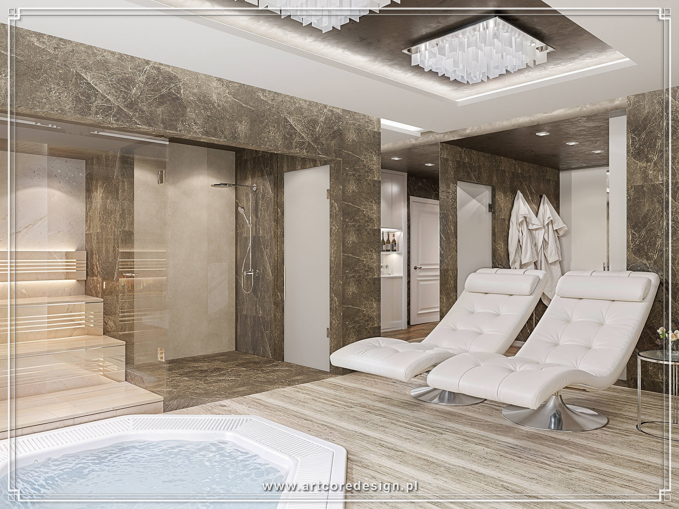 Nie sposób pominąć luksusowej łazienki, która zaskakuje przestronnością i wyrafinowaniem. Marmurowe wykończenia, designerska wanna wolnostojąca oraz kryształowe kinkiety nadają jej ekskluzywnego charakteru. Strefa SPA, wyposażona w saunę i jacuzzi, pozwala na chwile relaksu w domowym zaciszu.