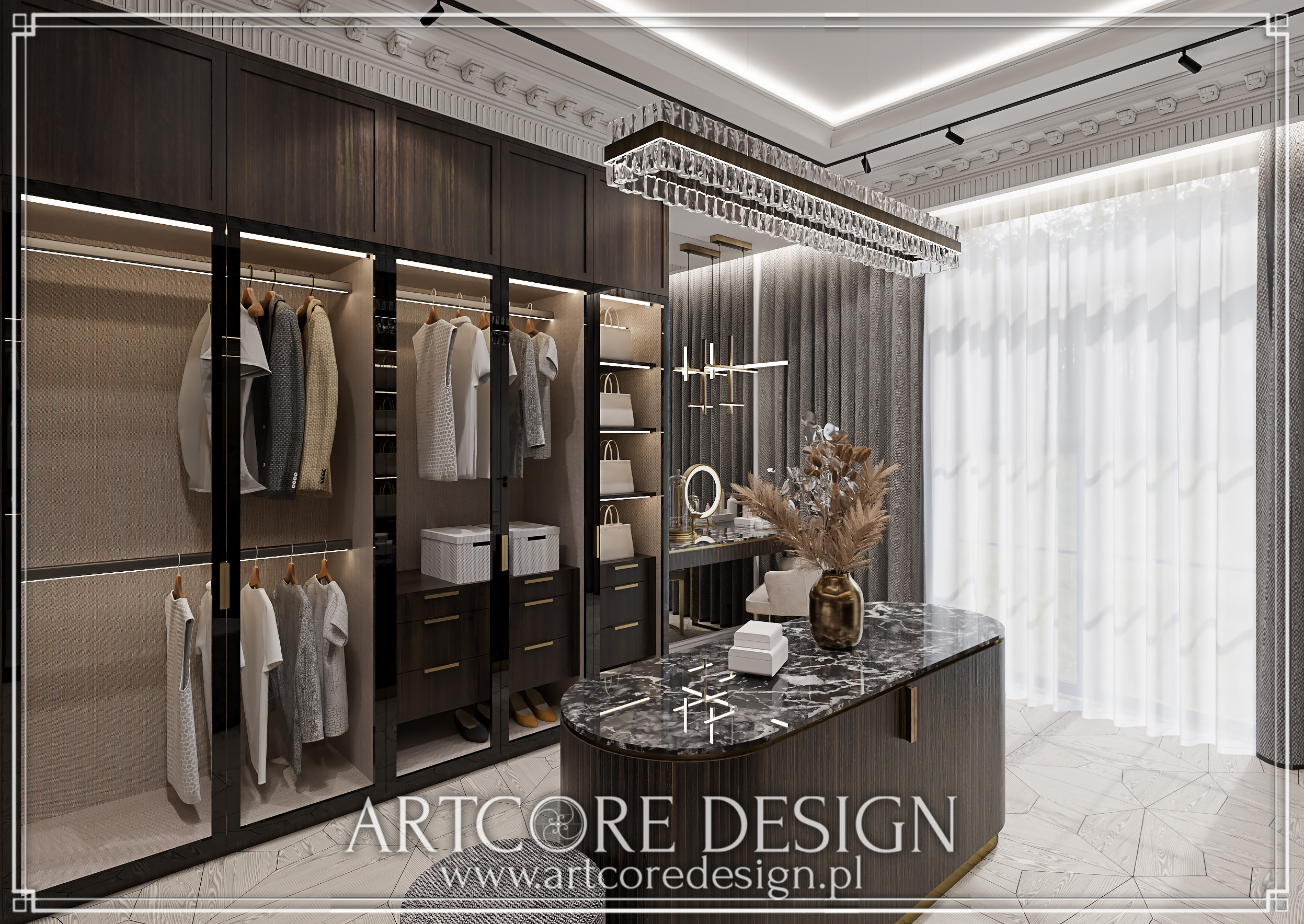 Garderoba zachwyca nowoczesnym designem i praktycznymi rozwiązaniami. Przestronna marmurowa wyspa oraz podświetlane witryny zapewniają doskonałą organizację i elegancję. To przestrzeń, która spełni oczekiwania nawet najbardziej wymagających użytkowników.
