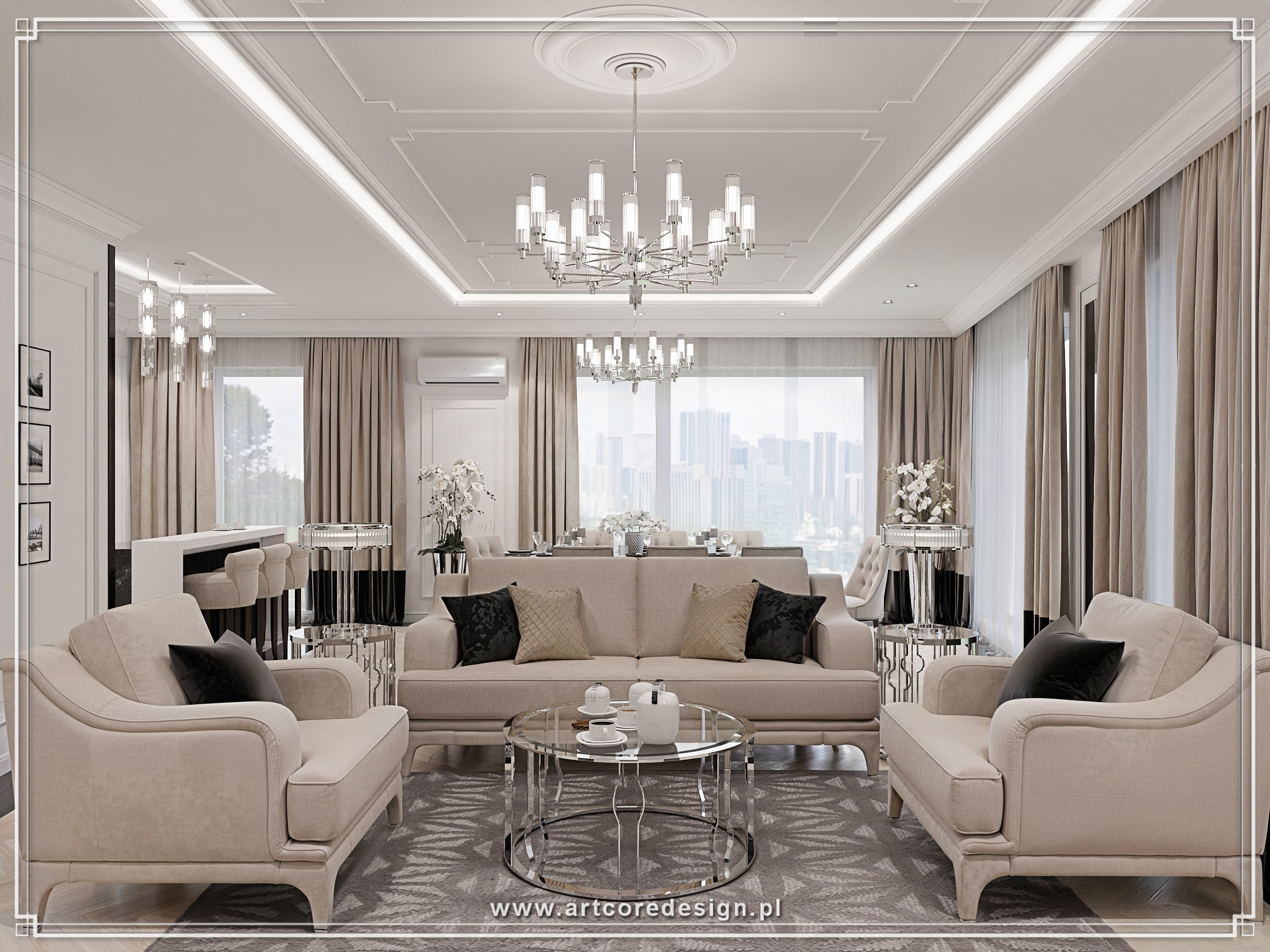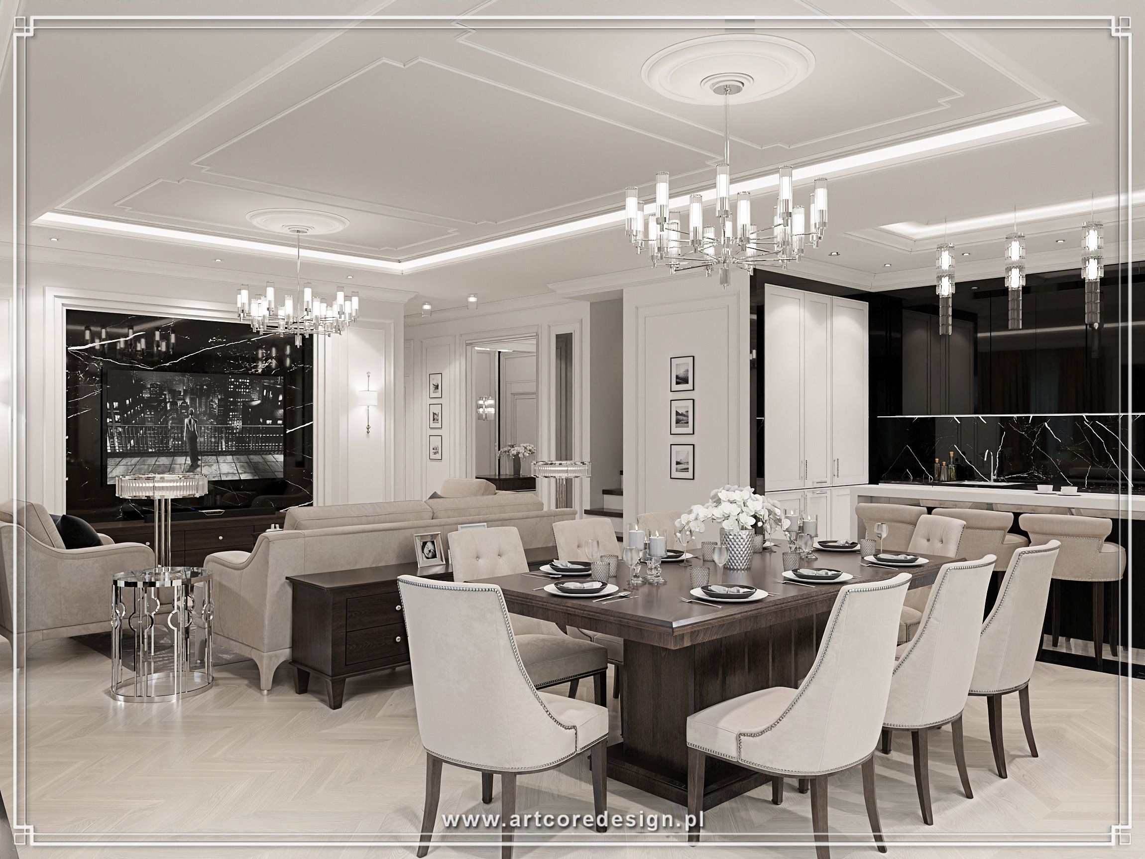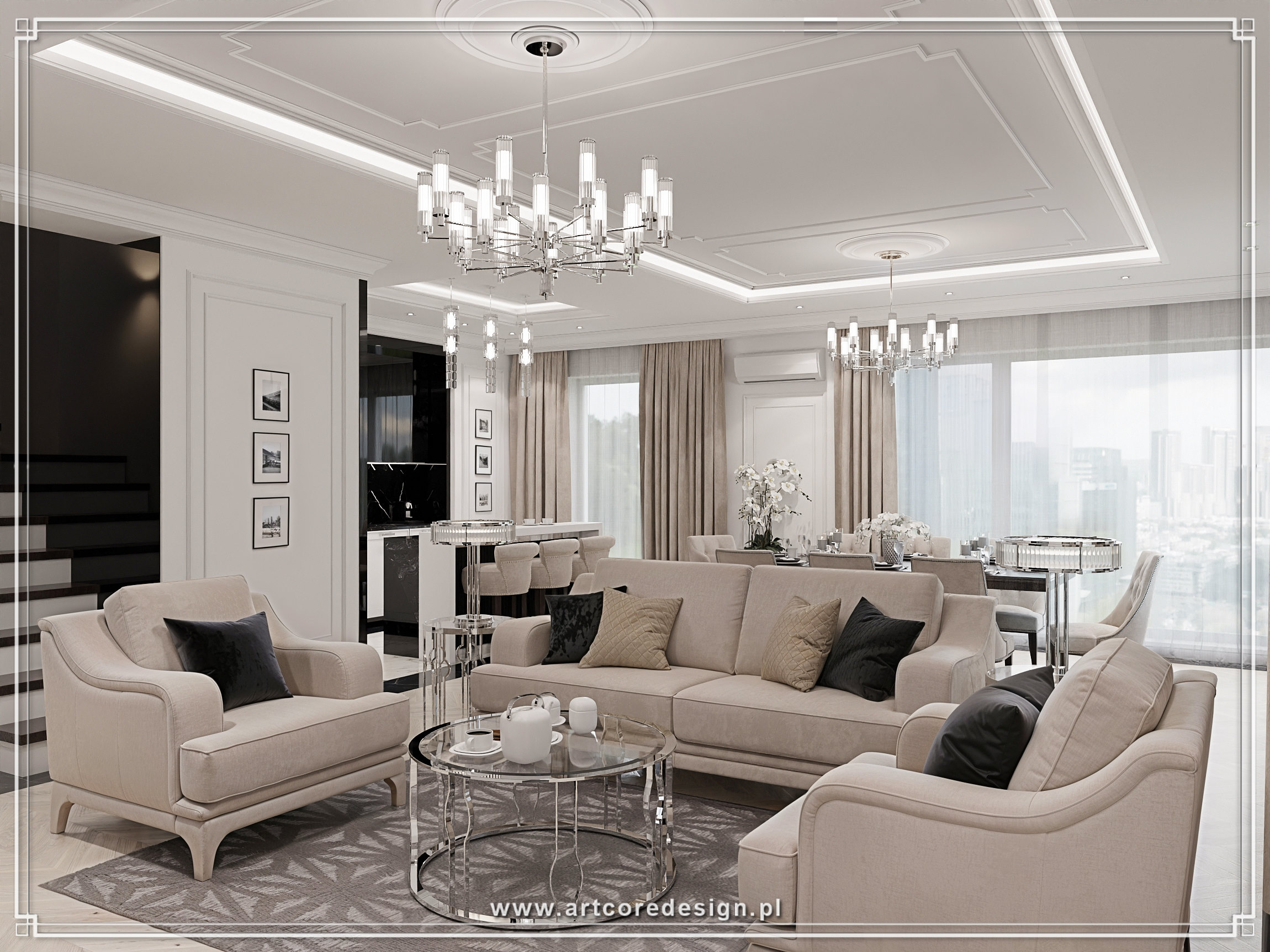 Elegancja i ponadczasowy styl to główne cechy tego wyjątkowego projektu rezydencji. Dominują tu stonowane barwy – odcienie bieli, szarości i beżu, które doskonale współgrają z elementami czerni oraz akcentami w połyskującym chromie. W salonie uwagę przyciągają luksusowe sofy oraz kryształowe żyrandole, które subtelnie rozświetlają przestrzeń. Wielkoformatowe przeszklenia zapewniają dostęp do naturalnego światła, otwierając wnętrze na otaczający ogród.