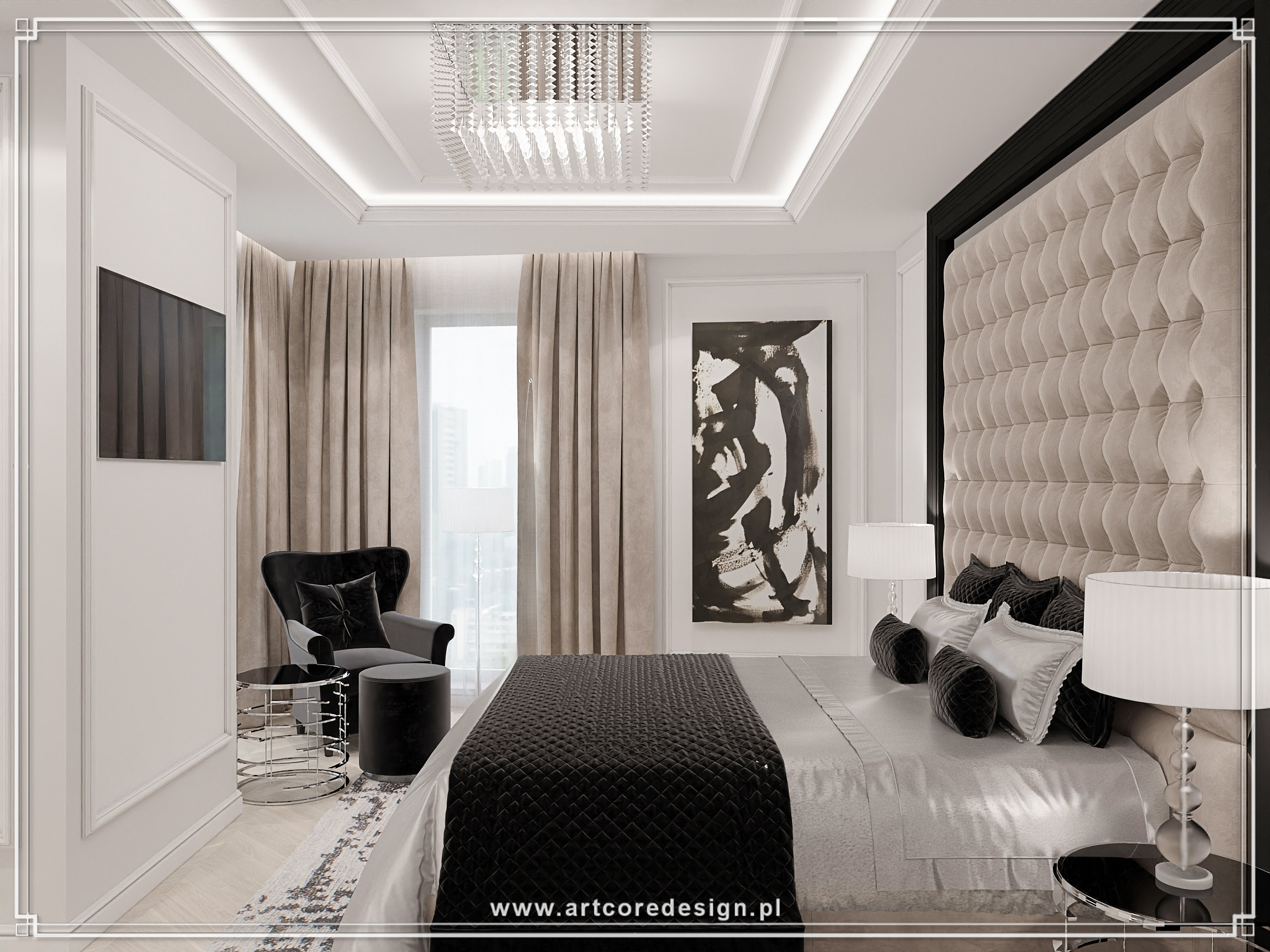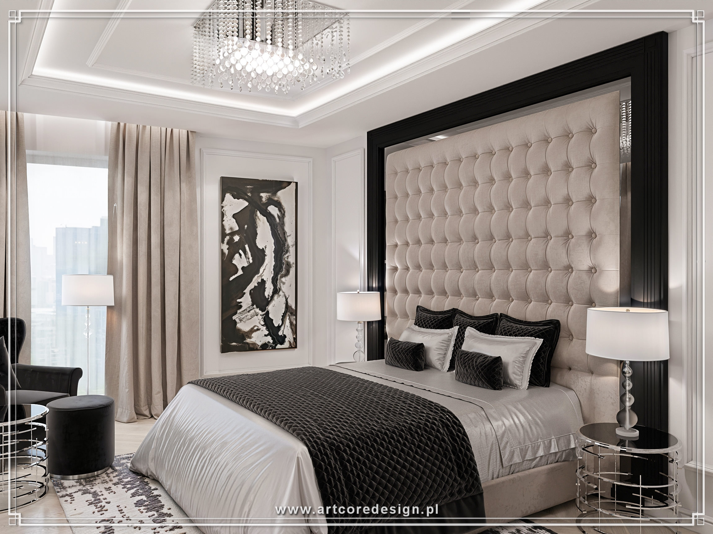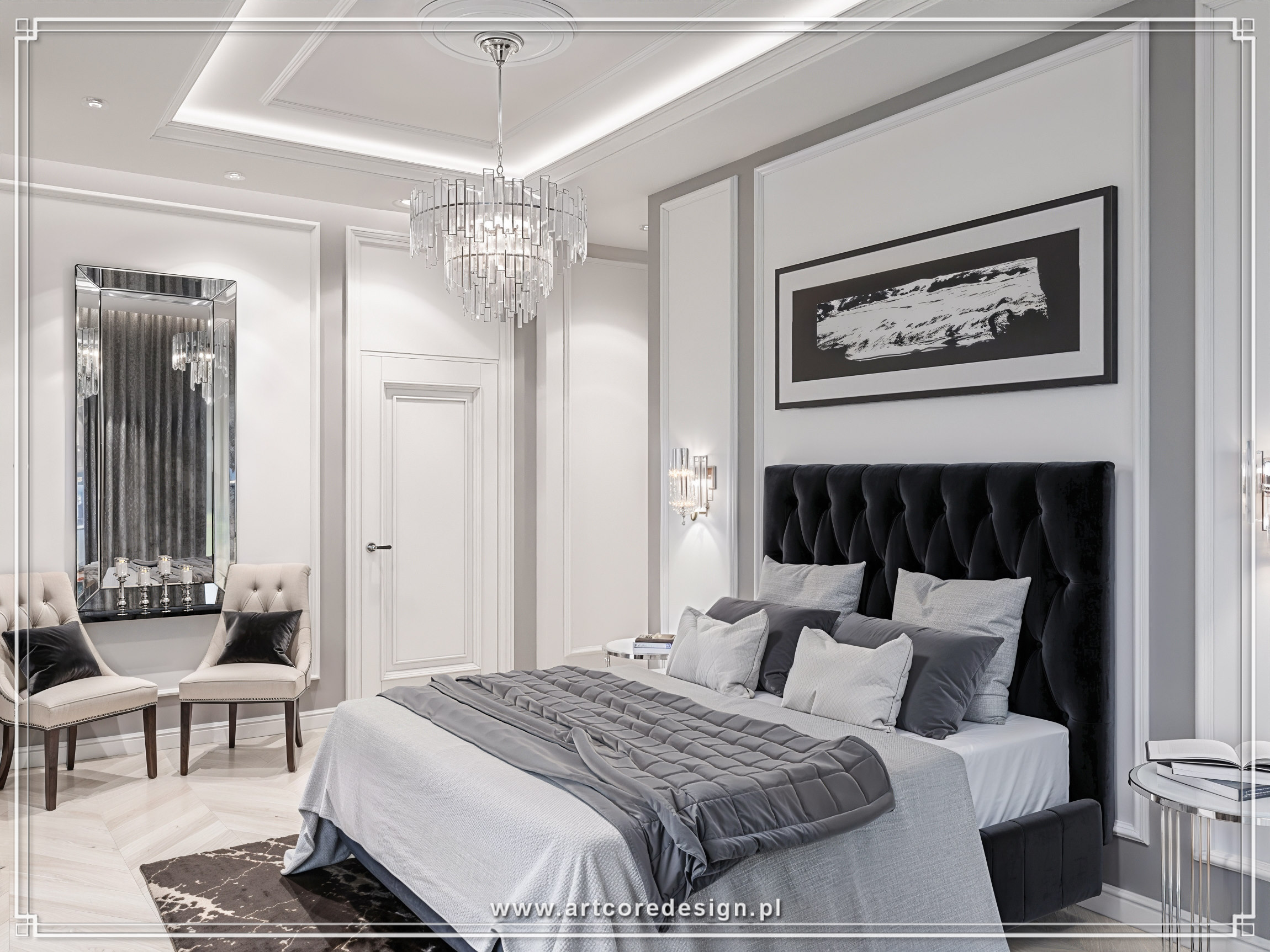 Elegancja i ponadczasowy styl to główne cechy tego wyjątkowego projektu rezydencji. Dominują tu stonowane barwy – odcienie bieli, szarości i beżu, które doskonale współgrają z elementami czerni oraz akcentami w połyskującym chromie. W salonie uwagę przyciągają luksusowe sofy oraz kryształowe żyrandole, które subtelnie rozświetlają przestrzeń. Wielkoformatowe przeszklenia zapewniają dostęp do naturalnego światła, otwierając wnętrze na otaczający ogród.