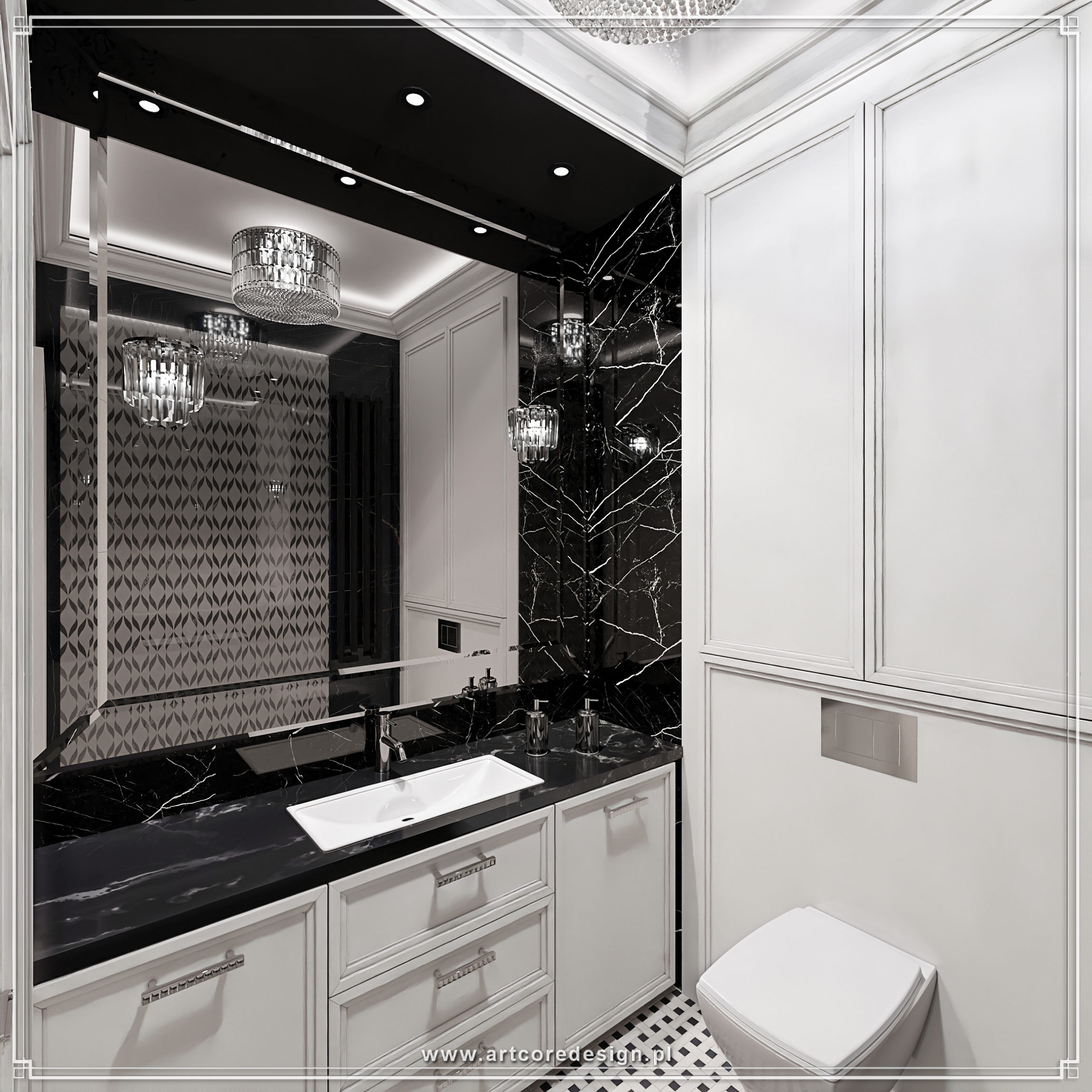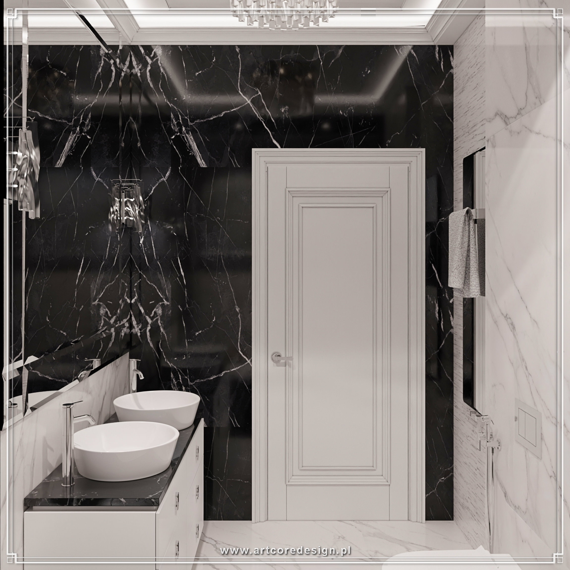 Łazienki w projekcie to prawdziwe oazy relaksu, wypełnione marmurem i wyrazistymi kontrastami między bielą a czernią. Każdy detal, od wolnostojącej wanny po chromowane akcesoria, został dopracowany z myślą o najwyższym komforcie użytkowania. Przestrzeń spa i siłownia zapewniają możliwość regeneracji i dbania o kondycję w zaciszu własnego domu.